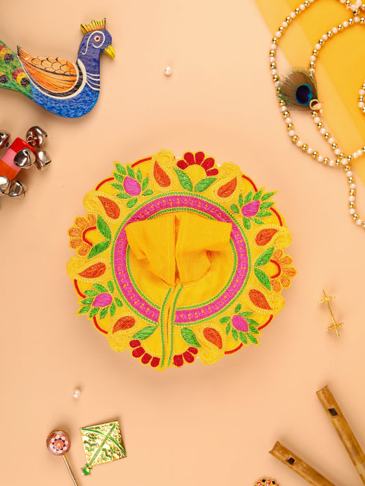 This stunning yellow Laddu Gopal poshak features an exquisite peacock floral (Mayur Pushp) design that enhances the divine appearance of your Thakur Ji. The bright yellow color symbolizes joy, positivity, and prosperity, making it ideal for Basant season, festive days, and special pooja rituals.