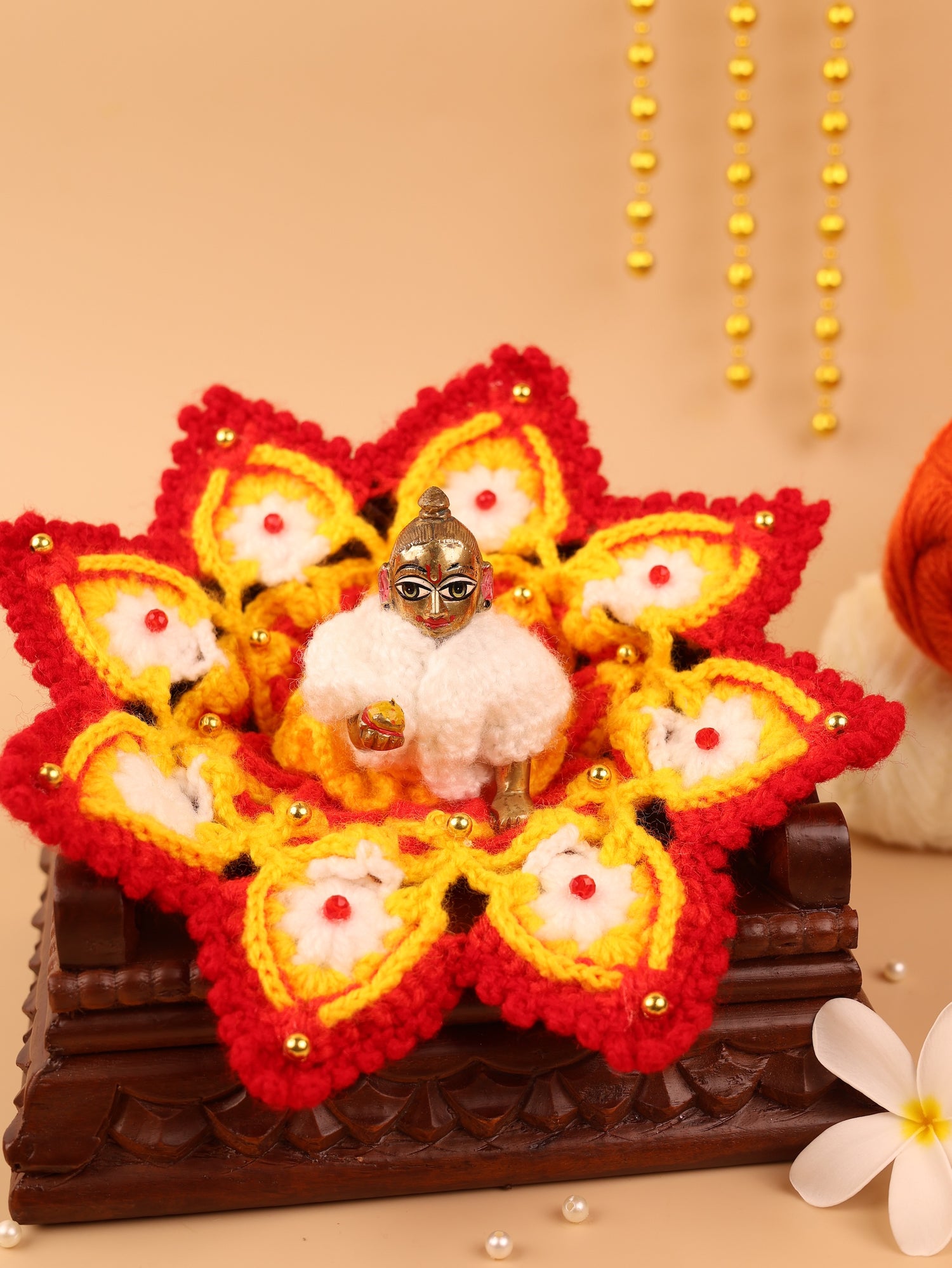 The Sunehri Orange Wool Laddu Gopal Poshak brings a bright, festive aura with its stunning flower-inspired design and rich handcrafted detailing. Made from soft wool, it offers a perfect fit and a radiant look for your deity. Ideal for puja, celebrations, and special shringar to create a truly divine presentation.