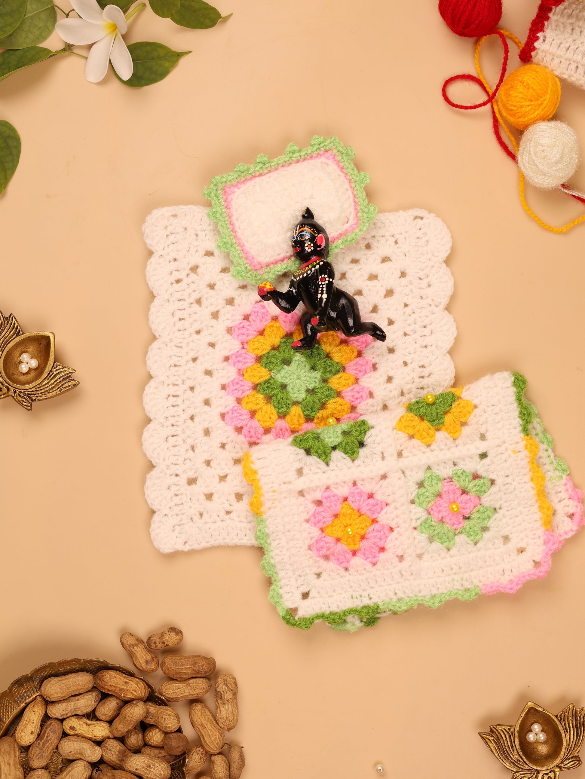 The Ananda Bedding Set for Laddu Gopal brings divine comfort and timeless charm to your Krishna’s singhasan. Handcrafted with soft, pure wool, this granny square crochet bedding is made with love, patience, and devotion. Cozy, soft, and one-of-a-kind, this hand-crocheted Krishna bedding is perfect for temple décor, devotional gifts, and special celebrations this winter.