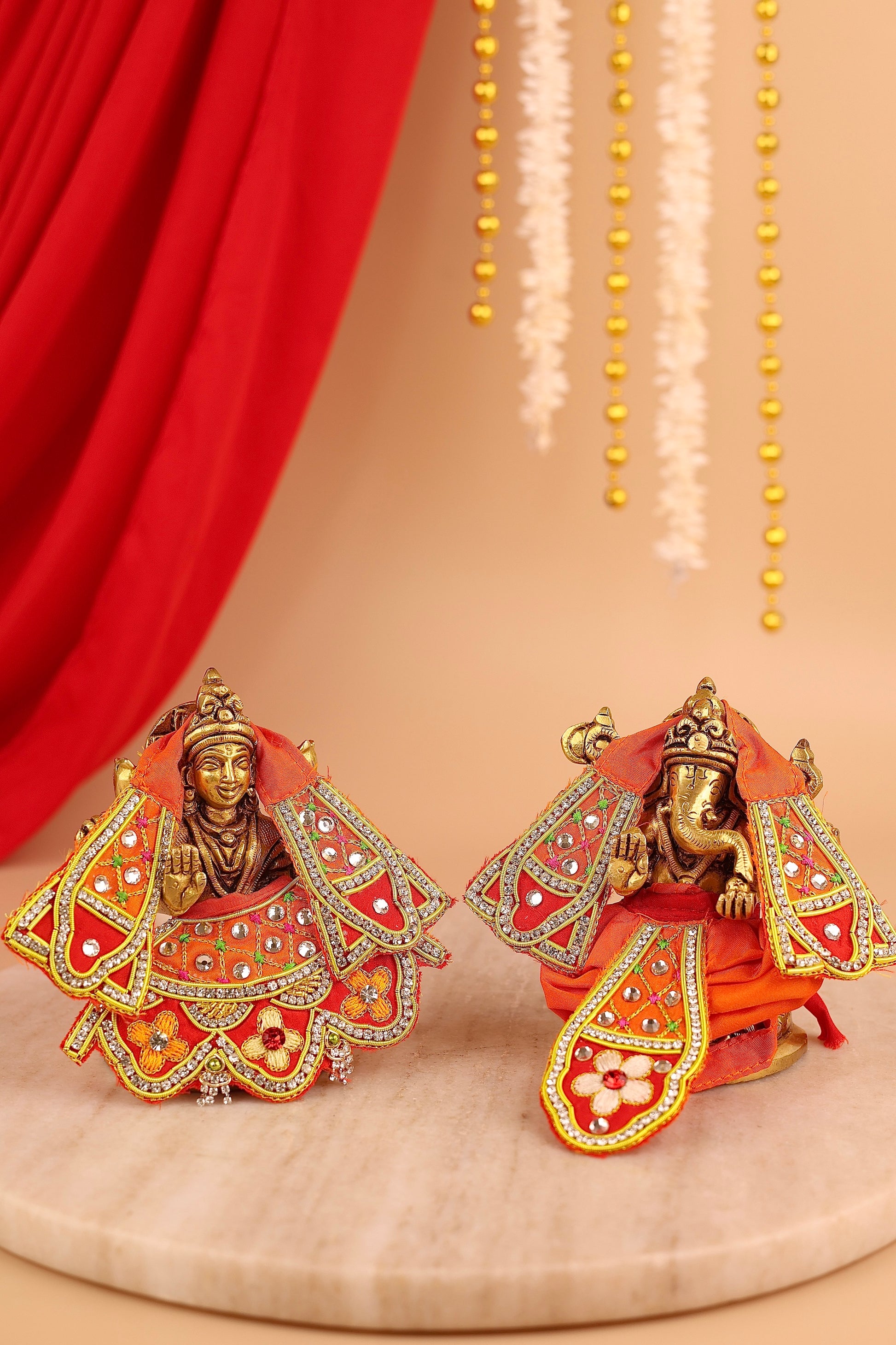 Perfect for big celebrations like Navratri and Diwali, the Madhur Leela lehenga-dhoti set features a temple-cut border with multi-colored zari, embroidery, silver crystals, and sequin highlights. The lehenga patka and dhoti patka for Krishna can be complemented by hand-embroidered Mala & Mukut. Beautifully packed in a golden fabric pouch, it’s ideal for dressing your Yugal Jodi or Ganesh Laxmi idols.