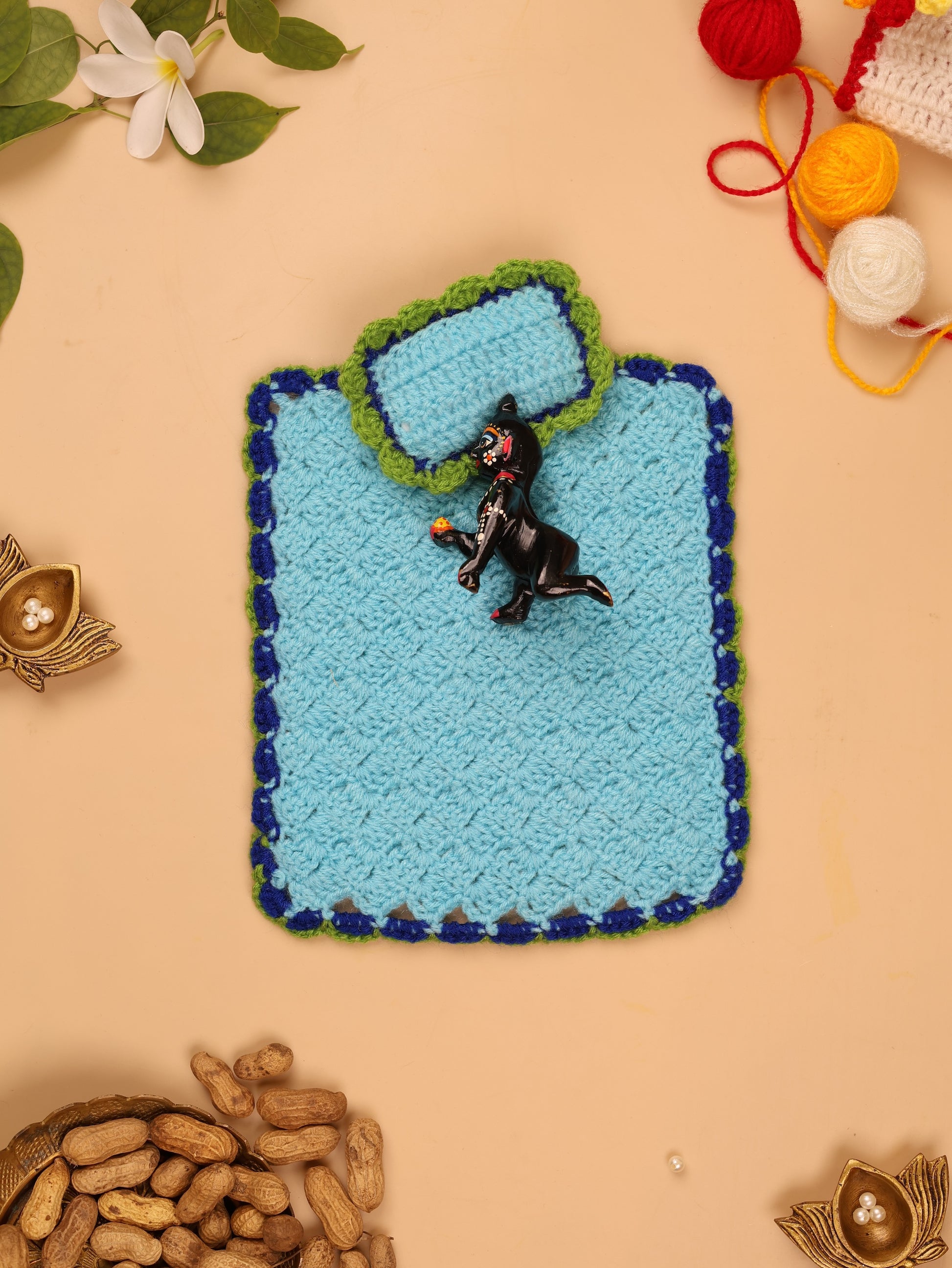 Inspired by the divine beauty of the peacock — a symbol of Krishna’s grace — this bedding set brings Vrindavan’s royal charm to your Laddu Gopal’s singhasan. This soft woollen bedding shines in peacock hues of blue, green & yellow. Hand-crocheted with bhakti to bring winter comfort to our beloved Thakurji.